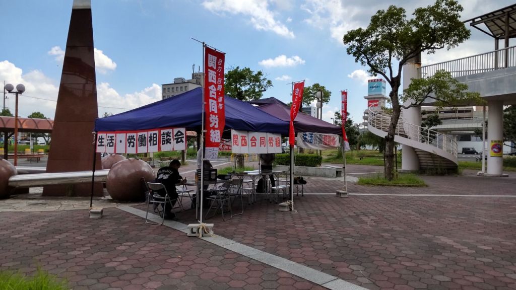 9月17日11時から15時まで、関西合同労組滋賀支部は、琵琶湖ユニオン、連帯ユニオンゼネラル支部、きょうとユニオンと4者共催で近江八幡駅南口イオン前で、労働相談会をおこなった。参加者は琵琶湖ユニオンは稲森書記長、連帯ユニオンゼネラル支部はM組合とN組合員、きょうとユニオンはT組合員とサポートと会員のNさん。関西合同労組はY組合員と塚本執行委員の計7人の参加で、いつもよりは少ない参加者だったが相談は1件あり、燐家とのトラブルで行政に相談しても、まったく動いてくれないという話で、アドバイスをした。今回は事前に新聞は載せてくれなかったのと、ビラはポスティングを含めて1500枚撒いた。今回も参加者の交流は深めた。相談会の後、狭山市民の会しがの街宣を、近江八幡駅南口でおこなった。暑い1日だった