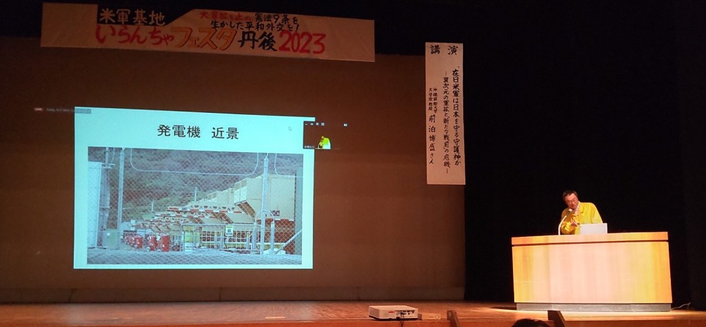 「いらんちゃフェスタ」は約350名が参加した。永井さんの現地報告があり、この1年の京丹後の米軍基地の動きを分かりやすく説明された。記念講演では沖縄から前泊博盛さんがオンラインで講演され、辺野古弾薬庫の現状等を詳しく報告された。主催者挨拶は、丹後連絡会代表の藤原さんがおこない、協賛団体の挨拶では、近畿連絡会からは京都から参加した瀧川順朗さんが発言された。集会後、雨の上がった峰山町内をデモ行進した。