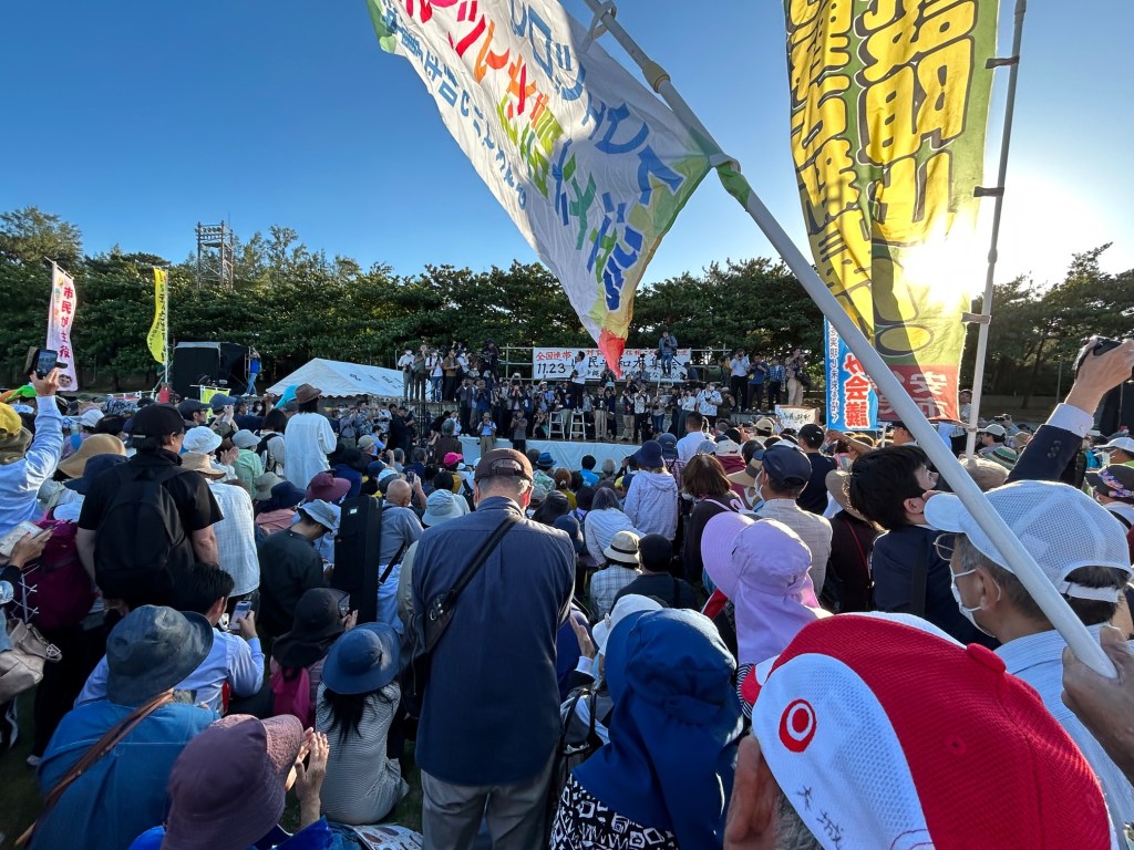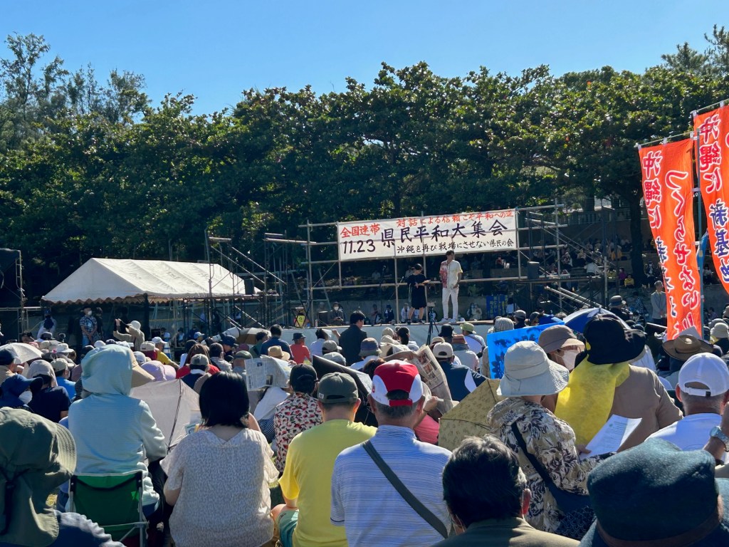 11月23日、沖縄・那覇市奥武山公園陸上競技場で県民平和大集会が開かれた。予想を超える1万人以上が参加し「沖縄を戦場にするな」「武力ではなく外交を」と声をあげた。