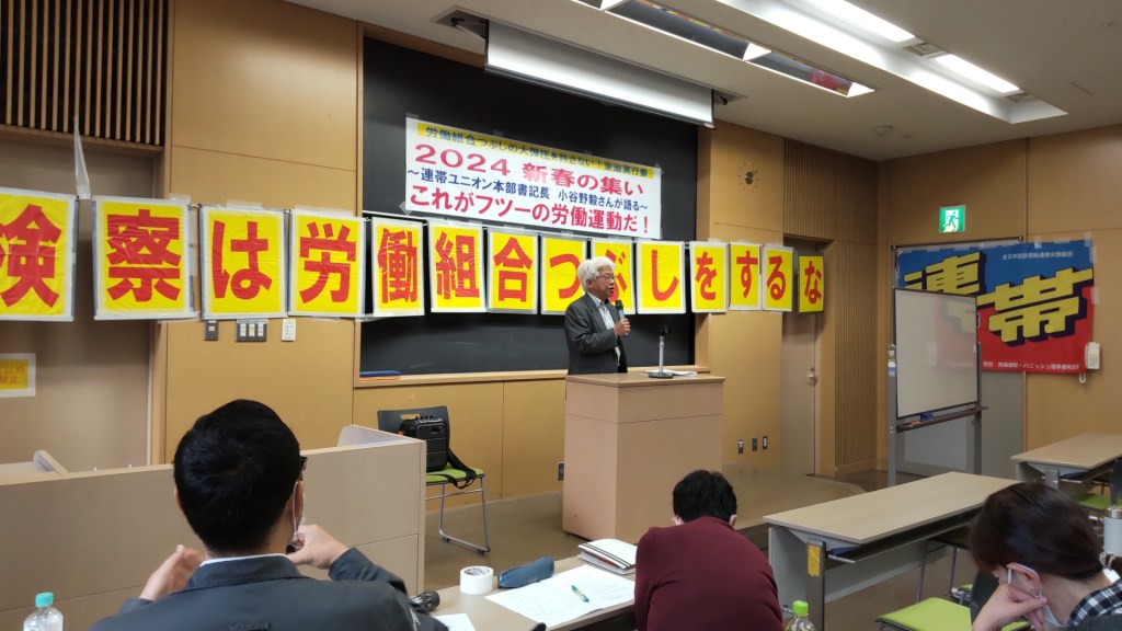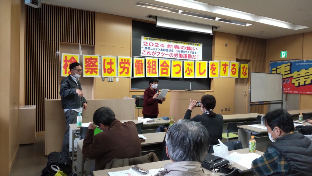 1月14日、労働組合つぶしの大弾圧を許さない!京滋実行委員会主催の「2024新春の集い」がおこなわれ、連帯ユニオン本部書記長の小谷野毅さんが「これがフツーの労働運動だ!」と題して講演された。これは、昨年9月15日にあった京都地裁での京都3事件裁判で小谷野さんが証人として証言された、自身が中心になって闘ってこられた4つの争議闘争(東芝アンペックス、パラマウント、麻生セメント、大分キャノン)の話があまりによかったので(あまりに説得力があり検察官は反対尋問を一切しなかった)、ぜひ京滋実行委で学習会をやってもらおうとして実現したものだ。小谷野さんは、この間の関生弾圧の現状について説明さえたうえで、それに基づいて問われていることと、自身の労働運動の経験に踏まえて、使用者概念拡大闘争や、争議闘争と解決金に関して、非常に示唆に富む教訓になる話をされた。