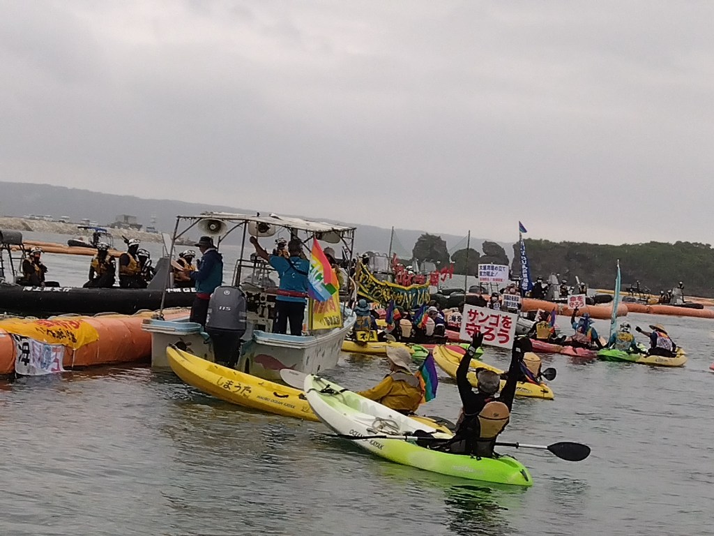辺野古新基地建設本体着工から7年をむかえ、「4・25辺野古・大浦湾海上大行動」が取り組まれた。主催は、ヘリ基地反対協議会・海上行動チーム。カヌーや平和丸などの抗議船に乗った45名が、辺野古埋立て地弾薬搭載エリアのk5、k6、k7護岸付近で抗議の声を上げた。「代執行NO!!」という横断幕を広げ、「代執行は許さないぞ!」「沖縄を再び戦場にするな!」「美しい海を守れ!」等のシュプレヒコールをくりかえした。
