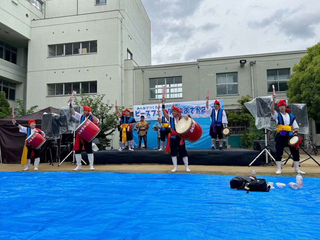 「戦争できる国づくりへと邁進する政府にNOを」「原子力発電所の再稼働にNOを」「私たちピースフェスタinおおさか実行委員会はこの想いを胸に平和の祭典を作りあげてきました。どうぞお楽しみください。」と実行委員会からあいさつ。会場には戦争、人権、差別と闘う労働組合、団体が多く集まった。いつもの集会とデモではなく、フェスタとしてお祭りとして行われた。