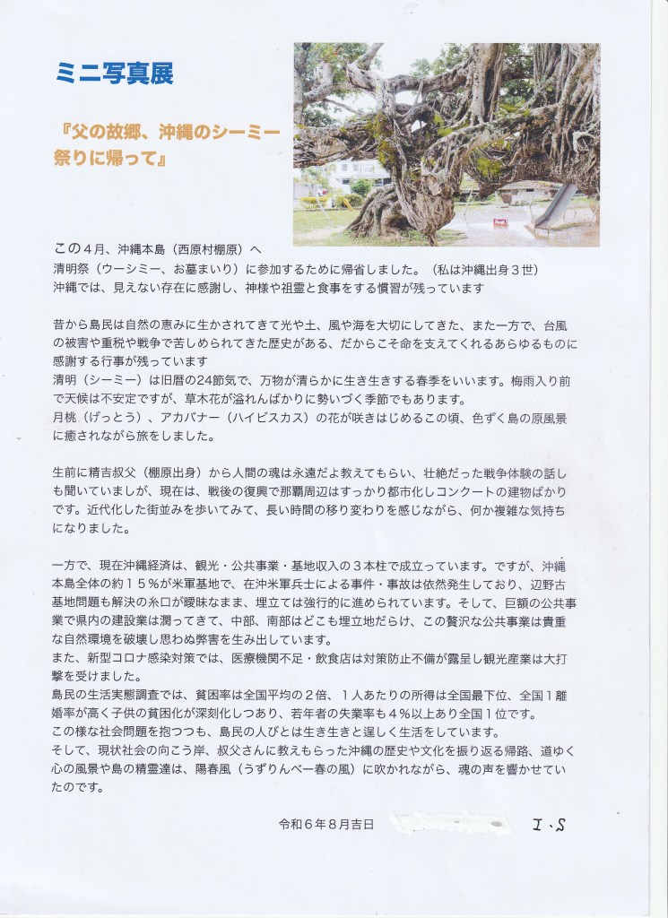 活動報告 組合員からの投稿 ミニ写真展『父の故郷、沖縄のシーミー祭りに帰って』 Date: 2024年5月30日Author: kansaigodo 0 コメント 共有: クリックして X で共有 (新しいウィンドウで開きます) X Facebook で共有するにはクリックしてください (新しいウィンドウで開きます) Facebook いいね 読み込み中… 関連
