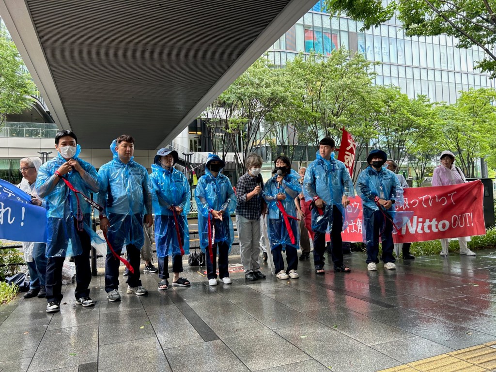 日東電工の100%子会社・韓国オプティカルハイテックでは、2022年10月に工場火災が起こった。日東電工は火災保険金を受け取りながら工場は閉鎖し、機材は韓国の別の子会社に移し、労働者を全員解雇した。韓国オプティカル労組の11名は、日東電工に対して話し合いを求め、雇用の継承を訴えている。11名の仲間の内8名が来日、3名が組合籠城、高空籠城(建屋屋上)「勝利するまで降りない」と争議の解決を求めている。