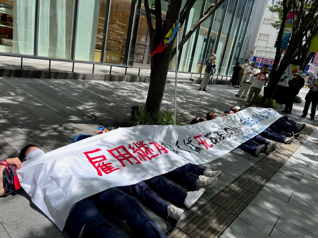 会場前では、支援労組のアピール、韓国オプティカルハイテック労組のパフォーマンス、シュプレヒコールなどがくりかえされた。特に、パフォーマンスのなかで、「雇用継承なくば死あるのみ、私たちは最後まで闘う!」という横断幕を広げ、来日した8名が寝ころんだ。決意を感じた。