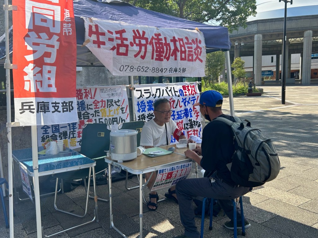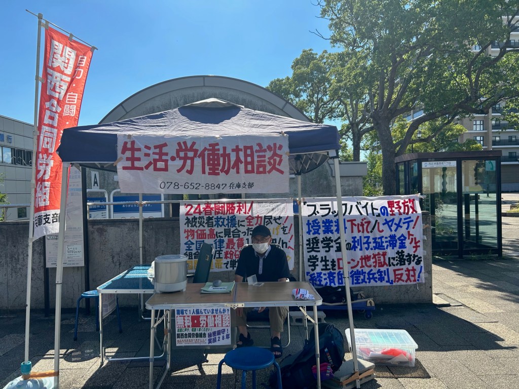 7月22日関西合同労働組合兵庫支部は、酷暑の中神戸市営地下鉄学園都市前駅にて労働相談テントを4名の参加で開設しました。