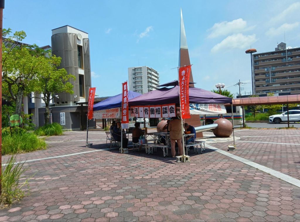 7月21日、きょうとユニオン、関西合同労組滋賀支部、琵琶湖ユニオン、連帯ユニオンゼネラル支部は4者共催で、11時から15時まで、近江八幡駅南口イオン前で、テントを張って労働相談会をおこなった。