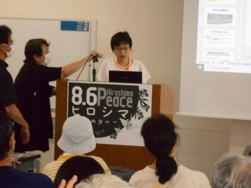 最初に3歳の時の被爆体験を千葉孝子さんが話されました。また千葉さんは原爆投下時刻の8時15分は、人が一番多く外に出ている時刻だからだったことを語りました。