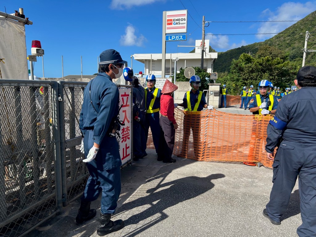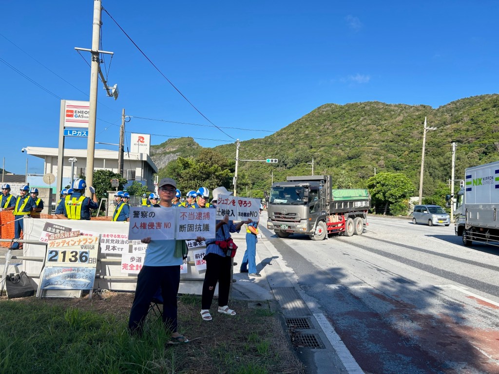 7日の午前中私は、安和行動に参加したのでその報告。今年6月28日、安和桟橋の出口付近で大型ダンプに警備員と市民が接触し、男性が死亡し抗議活動していた市民が負傷する事故が起こった。その事故についての検証が済まないなかで、8月22日安和桟橋での土砂搬入を強行している。安和桟橋の入り口にはテイケイの警備員25名ほどが棒にオレンジの網を巻き付けたもの持って、歩道の左右に配置され通行、抗議行動、牛歩を妨害していた。その反対側の出口には、ALSOKの警備員が同じように配置されていた。警備会社の交代要員を合わせて、約100名、沖縄県警の機動隊、沖縄防衛局の職員などが動員されていた。
