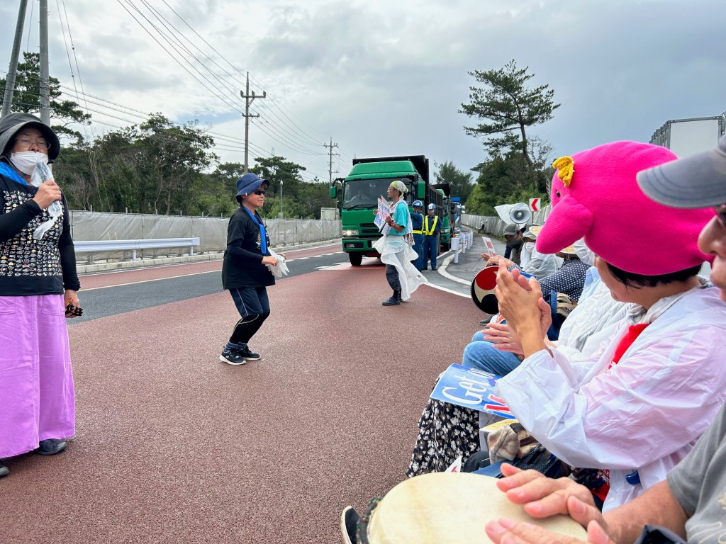 安和桟橋での抗議行動・牛歩は、歩道を歩く権利をたてにオレンジネット前での抗議、隙をついて歩道に出て牛歩をする。そうすると、テイケイの「ロボット」の赤いランプが回りサイレンが鳴る、耳が痛い。安和桟橋では、自動車による「牛歩」、トロトロ行くような車もあった。抗議活動している市民によると1日1000台を超える大型ダンプによる土砂の搬入がおこなわれ、以前に比べて増えている。