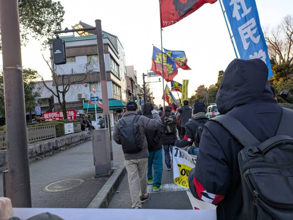 デモの前に京都地裁前で街頭宣伝があり、主催者の京滋実行委員会や関西生コン支部などが発言した。2月26日には湯川委員長に対する懲役10年求刑の判決が予定されており、裁判所には憲法28条を守ることが求められている。