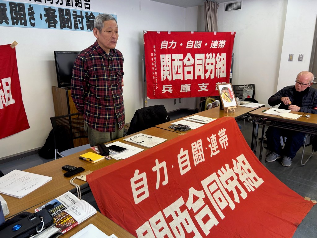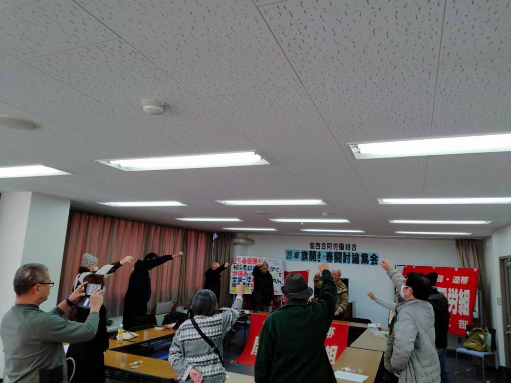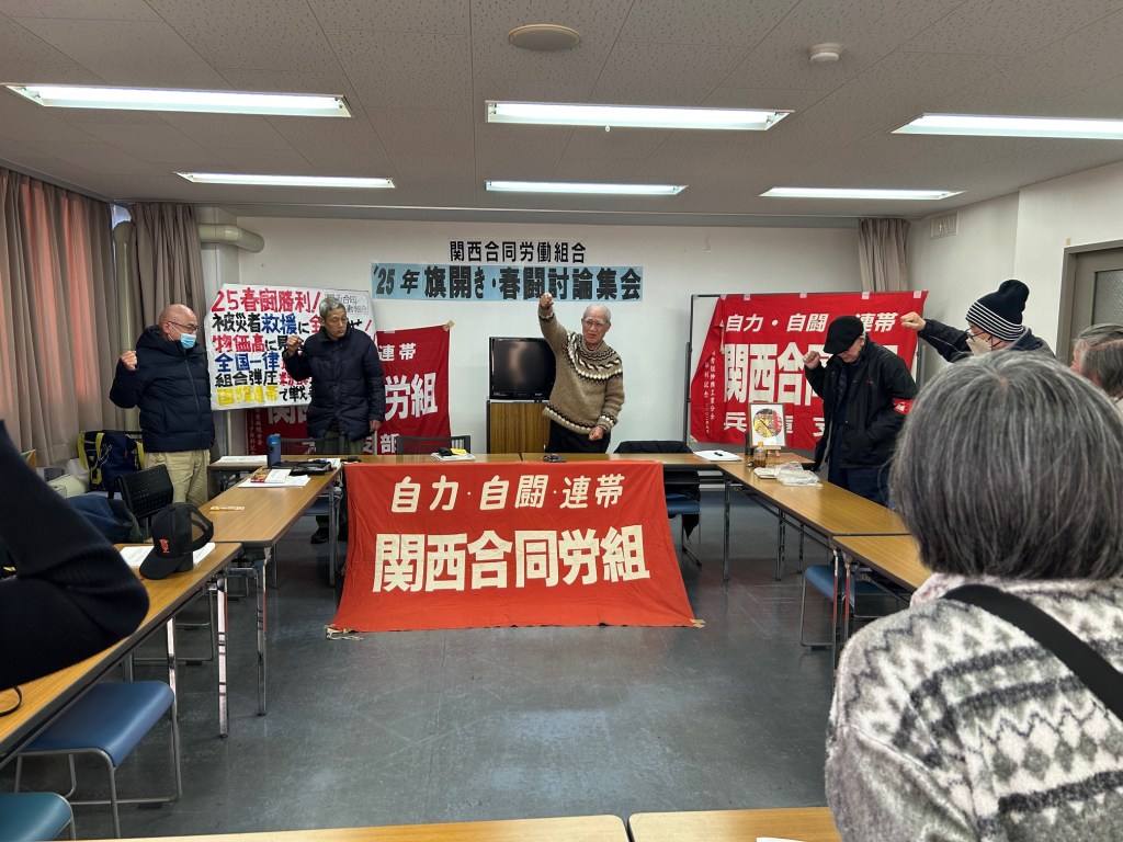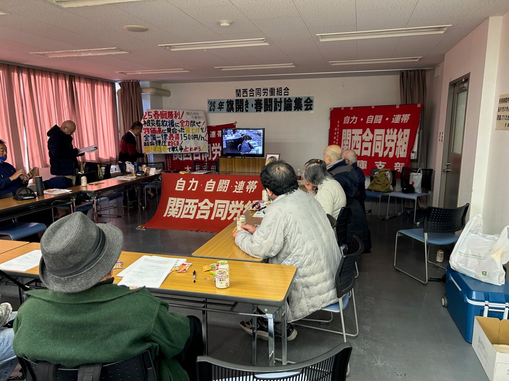 関西合同労働組合は1月26日西宮市立勤労青少年ホームにおいて、2025年旗開き・春闘討論集会を開催しました。佐々木委員長からの年頭あいさつの後、
