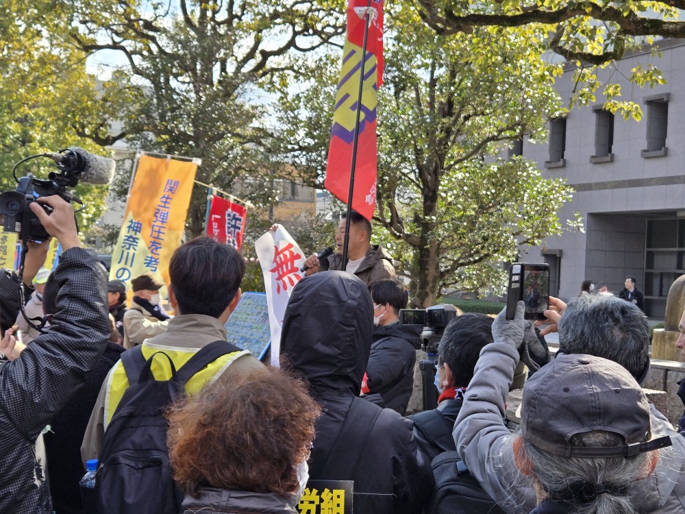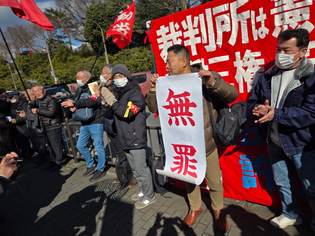 2月26日午前10時すぎ、全国から結集した労働組合員、支援者に無罪の報告がなされると歓声が上がり、全員でこの大勝利を確認しました。連帯労組関西生コン支部を先頭とした労働組合、各地の支援する会の団結が、懲役10年という重罪攻撃を打ち破ったのです。司法は生きていました。この大勝利を突破口にこの大弾圧の被告とされた仲間たち全員の無罪を勝ち取るために、さらに団結を固めて闘いに立ち上がりましょう!