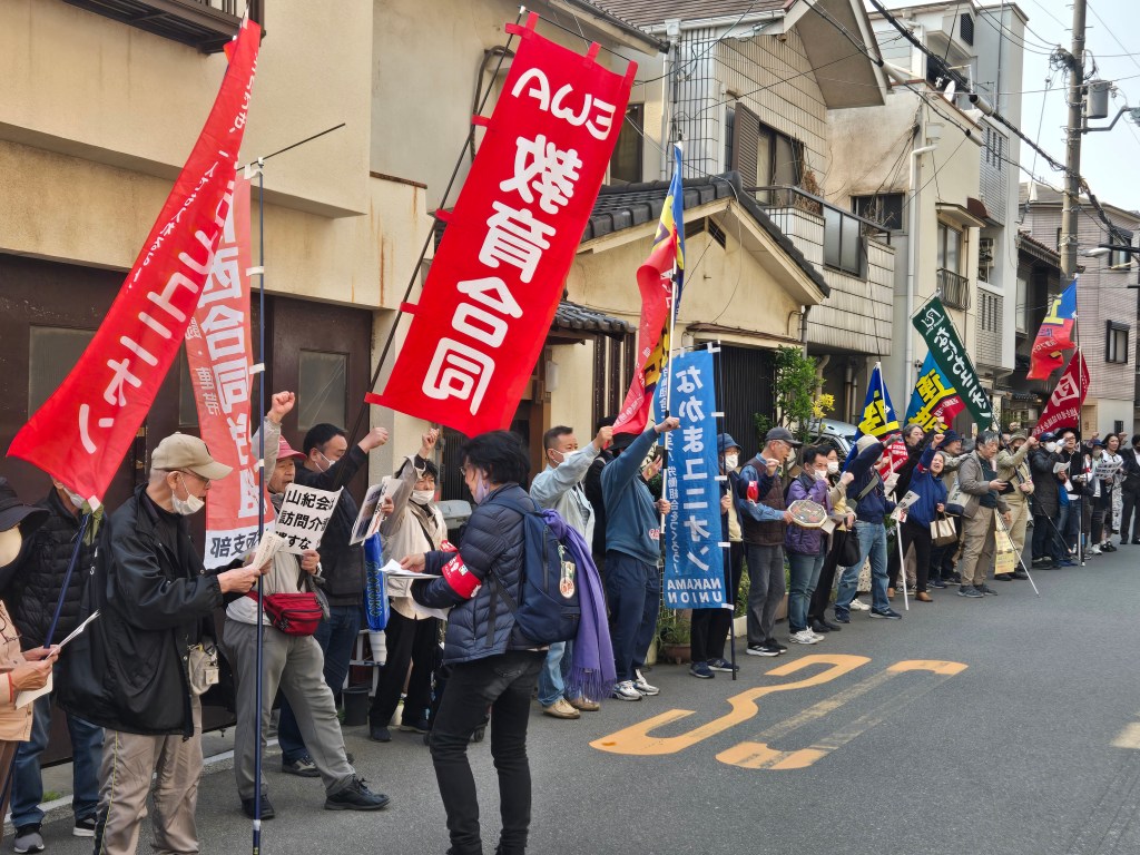 公益通報を理由として、1名解雇、2名の不当配転と闘うケアワーカーズユニオン堺・重症心身障害支部 三篠(みささ)会・ベルデさかい前で包囲行進