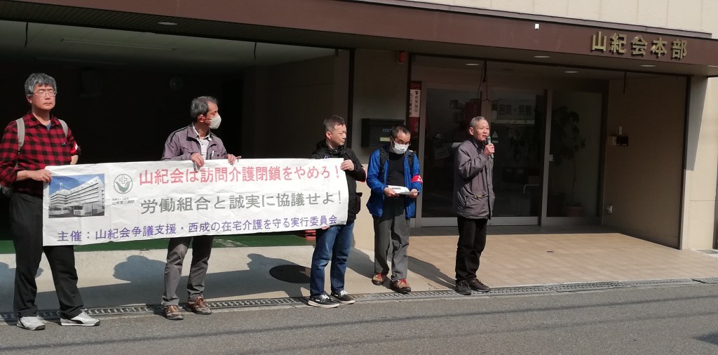 組合拠点である訪問介護事業所の閉鎖、支部役員の賃金切り下げと闘うケアワーカーズユニオン山紀会支部 関西合同労働組合からも佐々木委員長がアピール。