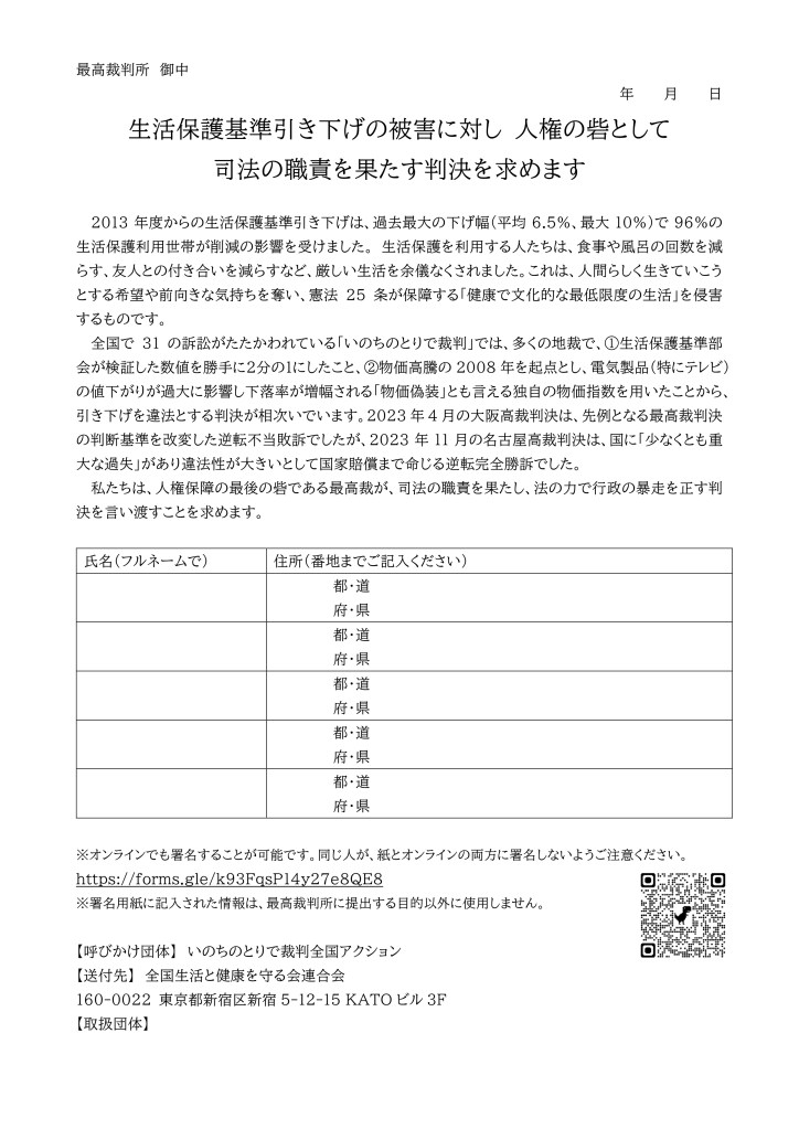 活動報告 「いのちのとりで裁判」最高裁宛の署名に協力お願いします Date: 2025年4月27日Author: kansaigodo 0 コメント 上の署名用紙のダウンロードはここをクリック 共有: クリックして X で共有 (新しいウィンドウで開きます) X Facebook で共有するにはクリックしてください (新しいウィンドウで開きます) Facebook いいね 読み込み中… 関連