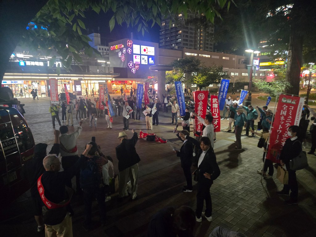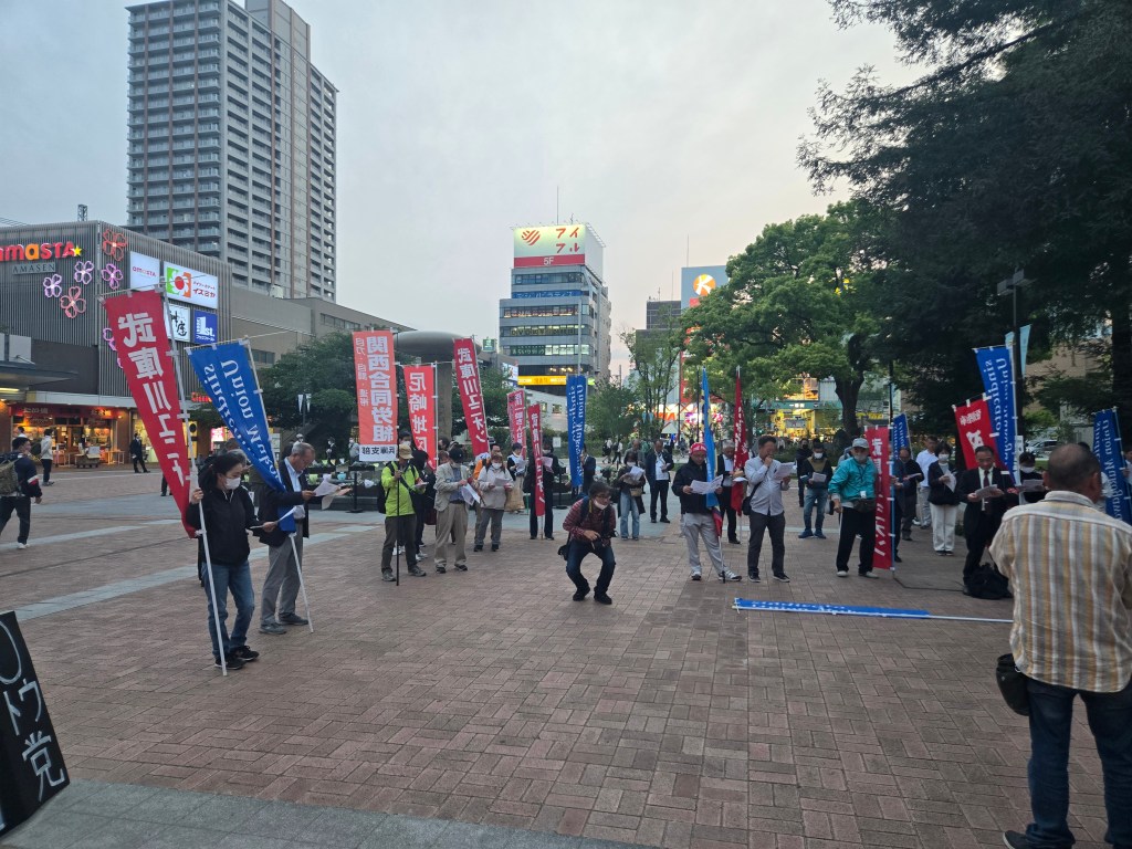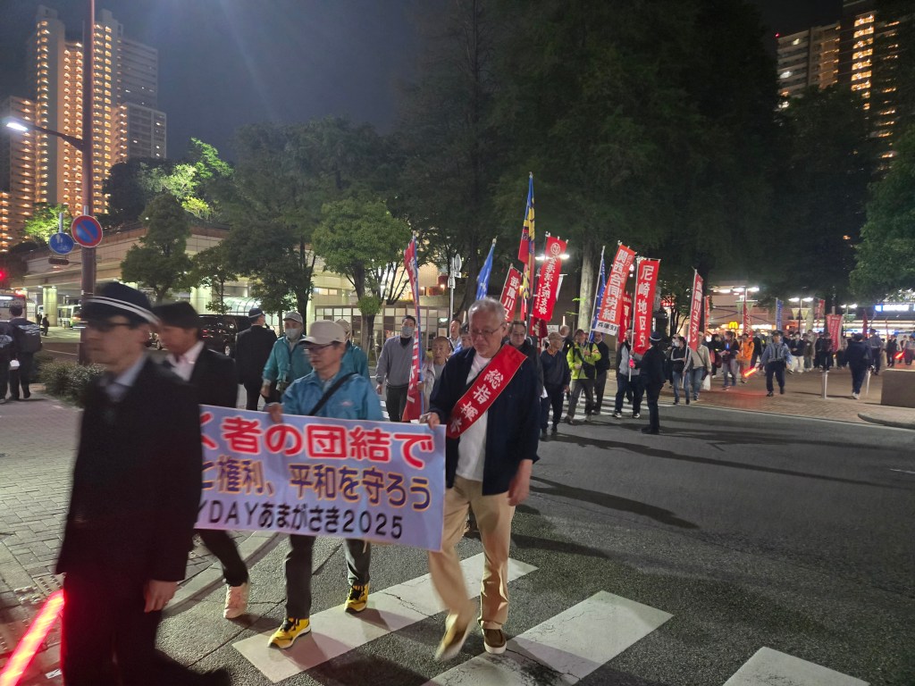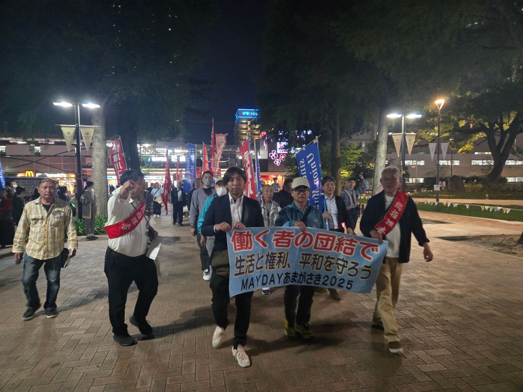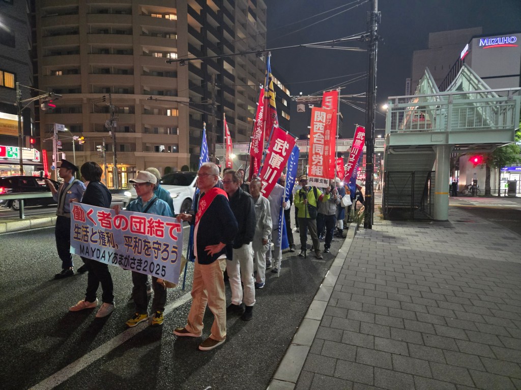 5月1日中之島メーデーから転戦して、18時30分から尼崎中央公園で行われた「MAYDAYあまがさき2025」に関西合同労働組合からも参加しました。全体は約100名の結集。