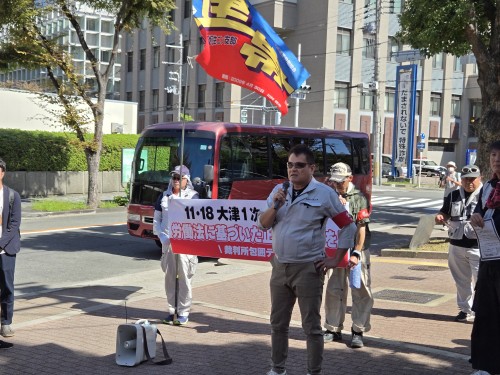 連帯労組関西生コン支部に対する弾圧・大津第1次事件の11月18日の高裁判決(一審大津地裁は連帯労組関生支部湯川委員長に対して懲役4年の超重罪判決を出した)に向けて、完全無罪を勝ち取るために裁判所の周りをデモをする行動が取り組まれた。