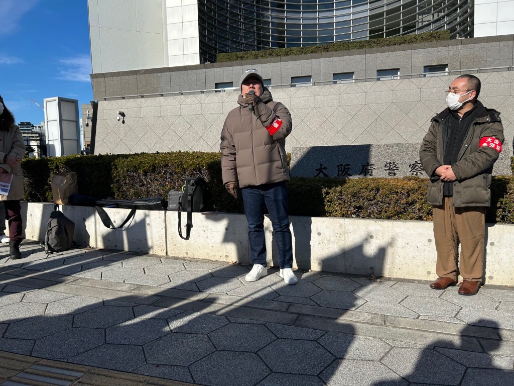 主催者あいさつが、小林勝彦反弾圧実行委員会代表からあった。小林さんは「元旦行動は200名からはじまりました。毎年、闘いのスタートはここから。そして『おかしいことはおかしい』と、仲間が呼びかけ闘いを大きくしてきました。これからも頑張りましょう。」