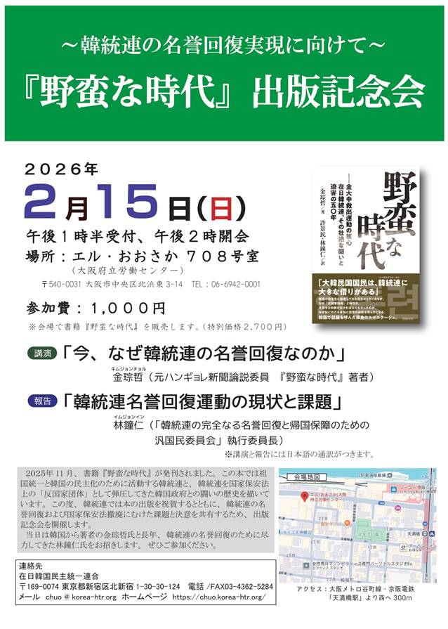 闘争スケジュール 2・15 ~韓統連の名誉回復実現に向けて~『野蛮な時代』出版記念会 Date: 2026年1月27日Author: kansaigodo 0 コメント 共有: X で共有 (新しいウィンドウで開きます) X Facebook で共有 (新しいウィンドウで開きます) Facebook いいね 読み込み中… 関連