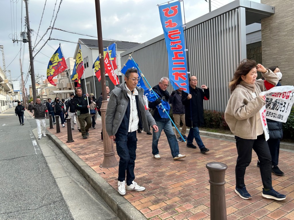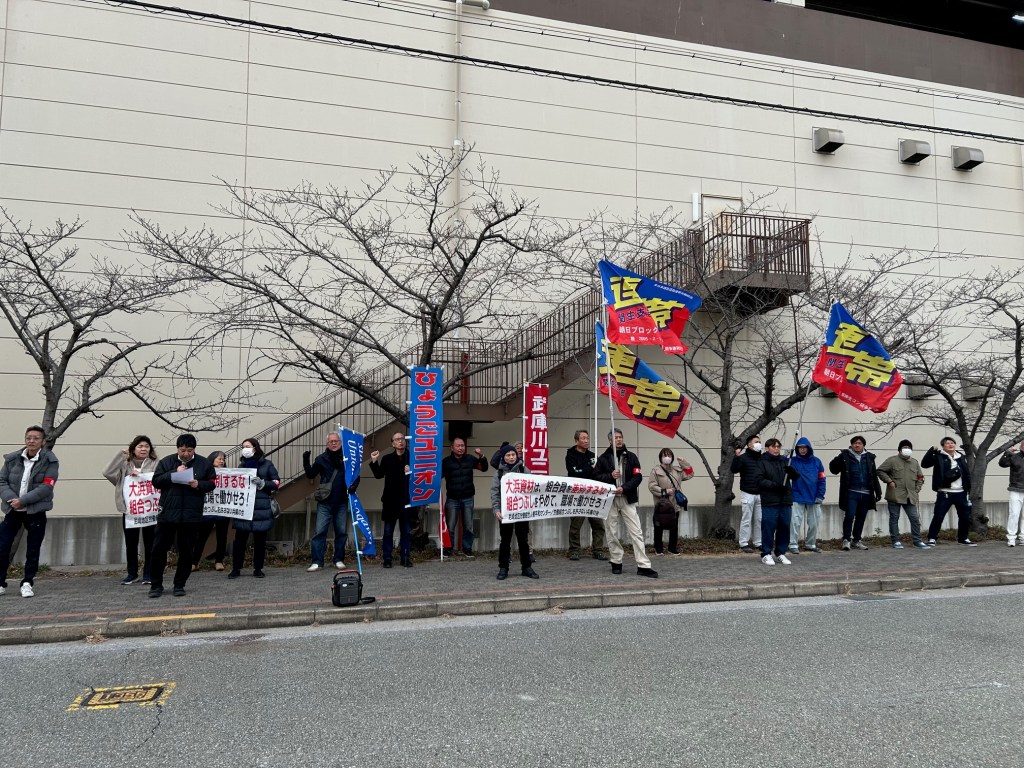 1月27日、「大浜資材は組合員を職場で働かせろ!組合つぶしをやめろ!差別をするな!」小集会とデモ、交渉会場での激励行動をおこなった。阪神出屋敷駅北緑地公園に30名の労働者が集った。