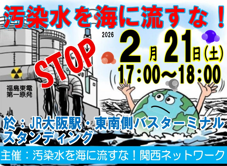 闘争スケジュール 2・21 汚染水を海に流すな!大阪駅前スタンディング行動 Date: 2026年2月16日Author: kansaigodo 0 コメント 共有: X で共有 (新しいウィンドウで開きます) X Facebook で共有 (新しいウィンドウで開きます) Facebook いいね 読み込み中… 関連