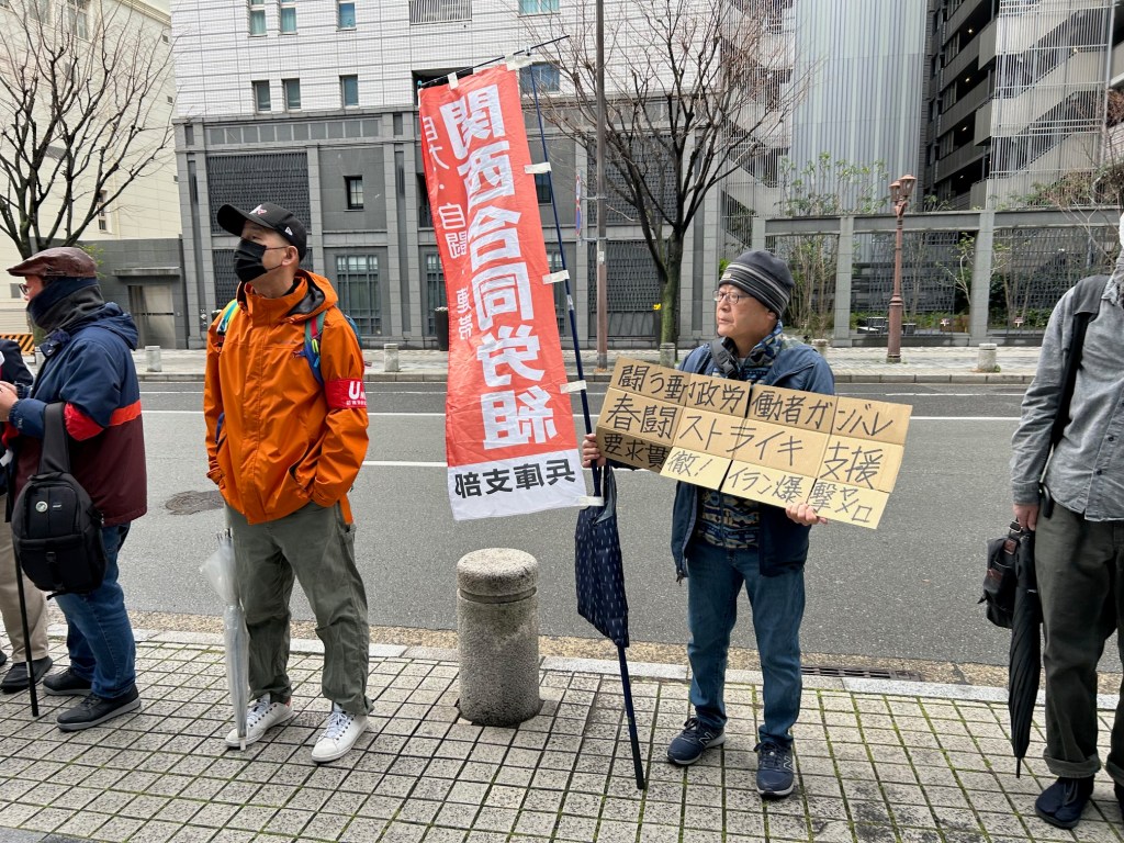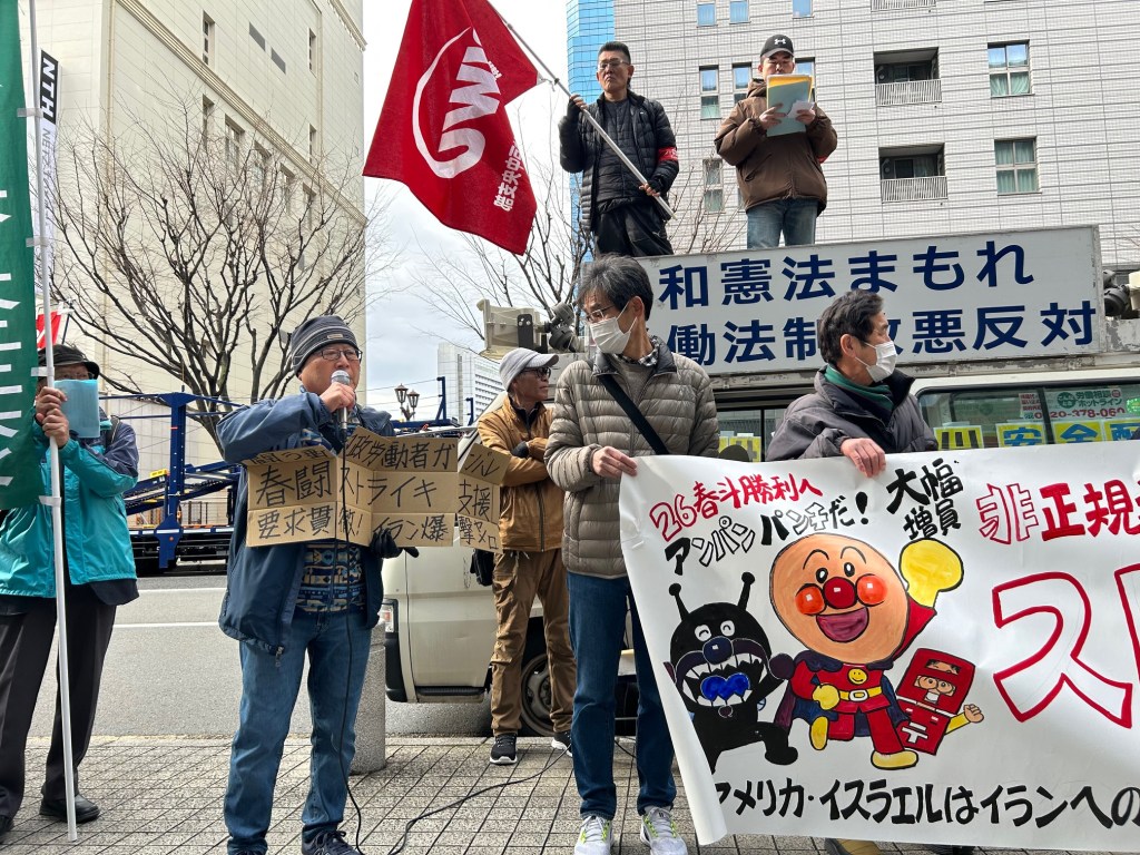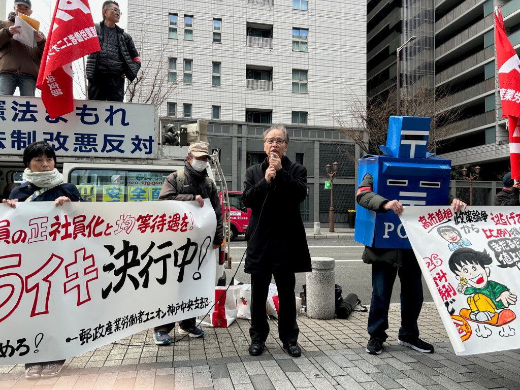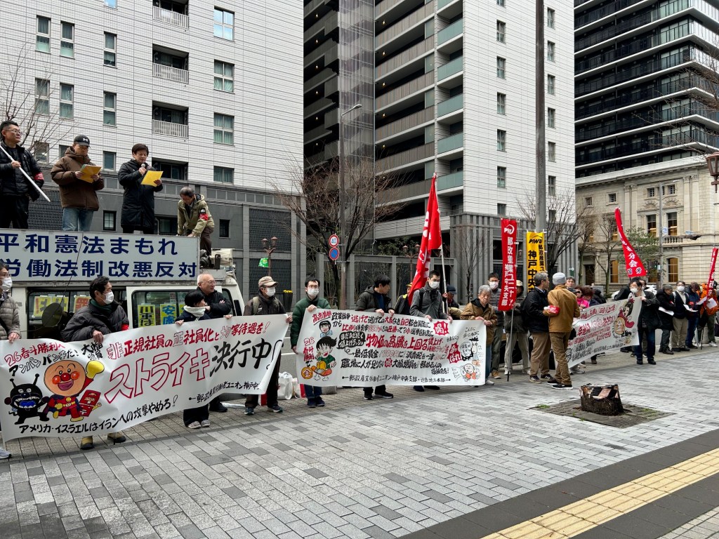 春闘, 活動報告 3・19 郵政産業労働者ユニオン神戸中郵支部 春闘ストライキ支援 Date: 2026年3月21日Author: kansaigodo 0 コメント 神戸中郵の仲間のストライキに多くの仲間が結集しています。さまざまな圧力を跳ね除けて闘う中郵の労働者がんばれ!全国でストライキで春闘闘う郵政ユニオンの仲間に激励を! 共有: X で共有 (新しいウィンドウで開きます) X Facebook で共有 (新しいウィンドウで開きます) Facebook いいね 読み込み中… 関連