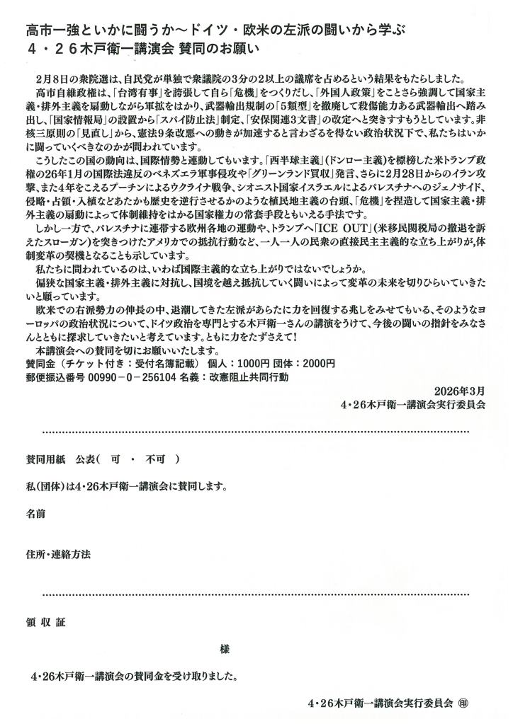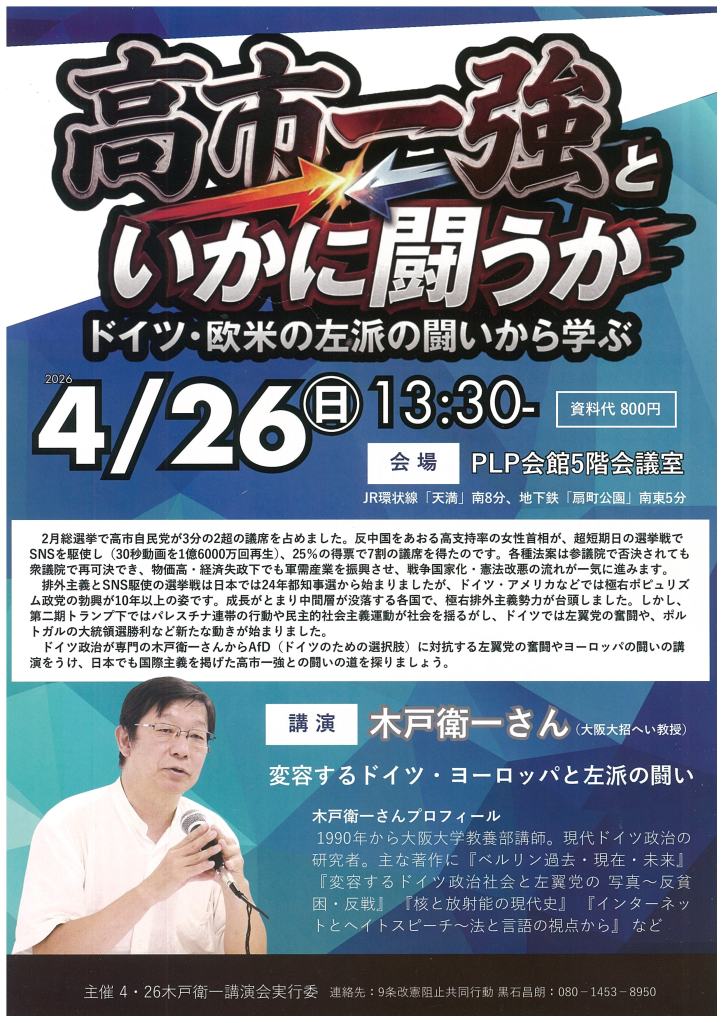 闘争スケジュール 4・26 高市一強といかに闘うか ドイツ・欧米の左派の闘いから学ぶ 木戸衛一さん講演会 Date: 2026年3月24日Author: kansaigodo 0 コメント 共有: X で共有 (新しいウィンドウで開きます) X Facebook で共有 (新しいウィンドウで開きます) Facebook いいね 読み込み中… 関連