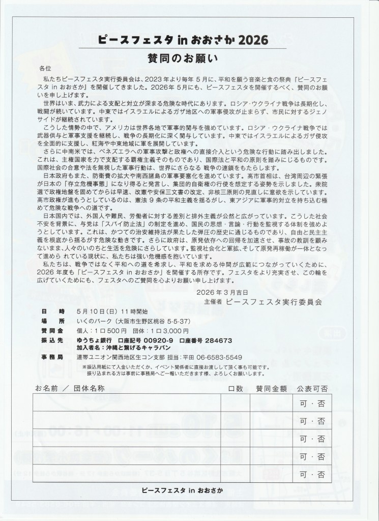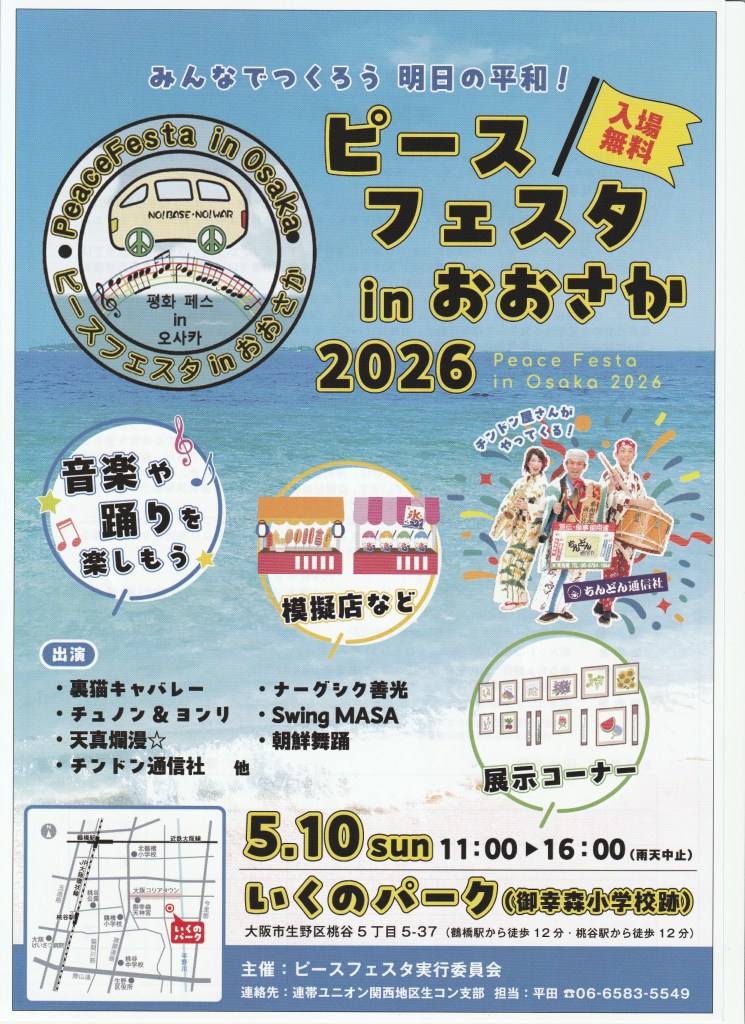 闘争スケジュール 5・10 ピースフェスタinおおさか2026 Date: 2026年4月1日Author: kansaigodo 0 コメント 共有: X で共有 (新しいウィンドウで開きます) X Facebook で共有 (新しいウィンドウで開きます) Facebook いいね 読み込み中… 関連