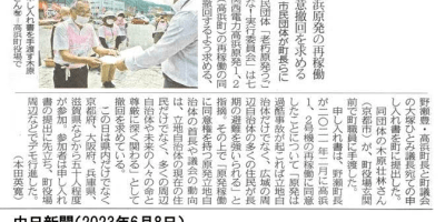 「高浜原発1・2号機再稼働反対を高浜町に申し入れ」記事 中日新聞 6月8日